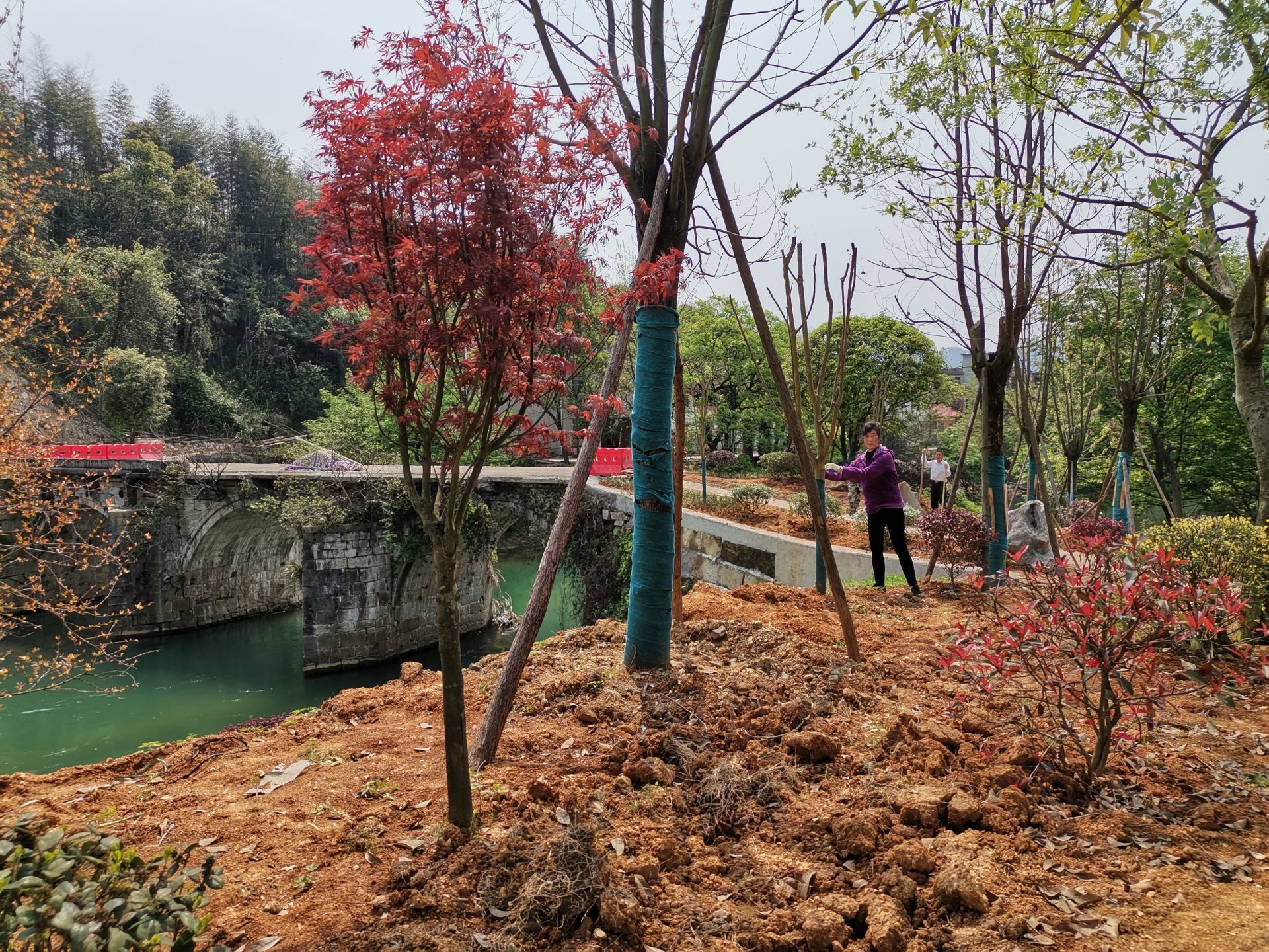 放眼望去,桥下清澈的淦水唱着歌儿欢快西流,3孔石礅下,游鱼细石历历可见,流水潺潺声仿佛在诉说着昔日辉煌;桥面上,用水马拦住形成禁行标志,另一边,几个工人正在为新桥打磨扶手。桥面宽阔,两侧栏边上还有多幅梅兰竹桂山水等雕花浮图。在新桥和老桥的桥头,几个村民正在义务为花木培土浇水,一个清新小游园跃入眼帘,与淦河生态景观浑然一体。