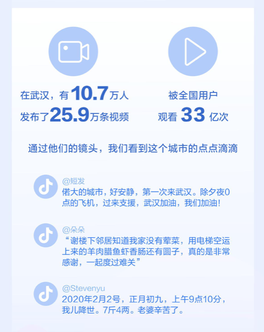1月23日,武汉宣布暂时关闭机场、火车站等离汉通道。1月24日-2月7日期间,抖音上共有10.7万人发布了25.9万条视频记录自己在武汉的日常。这些视频展示了武汉居民在此时期的真实生活状态:有外地医务人员支援武汉的辛勤,也有年轻爸爸迎来新生命的喜悦……发生在这座城市里的日常生活,被来自全国各地的用户累计观看共33亿次。