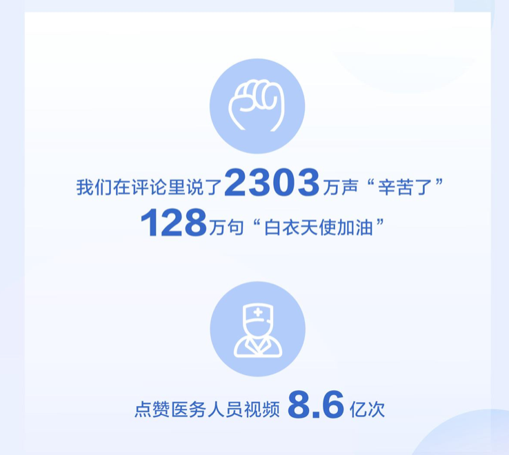 抗疫时刻,以医务人员为代表的有关工作人员始终坚守在最前线。报告显示,春节期间,抖音用户共发布了 2303万句个带有“辛苦了”和128万句带有“白衣天使加油”的评论,来表达对抗疫一线工作人员的感谢。