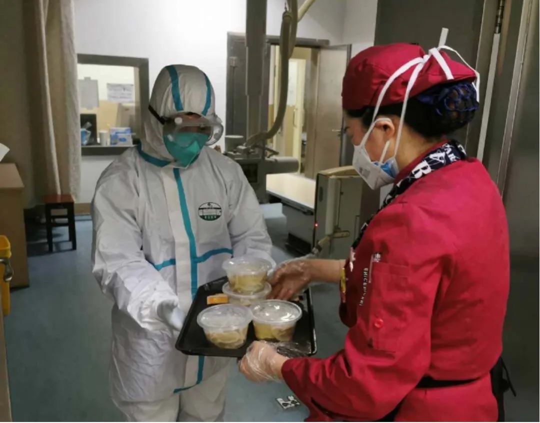 ▲除夕夜,商会副会长单位武汉新民天餐饮酒店管理有限公司员工将营养餐用到医护人员手中