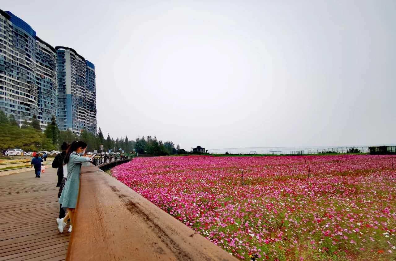 漫步江畔,五彩斑斓的格桑花一片片簇拥着,如灵动的彩蝶风中起舞,吸引了很多市民打卡留念。格桑花又称格桑梅朵,在藏语中寄托了幸福、吉祥的寓意。所以格桑花也叫幸福花,格桑花每年10月盛开,花期为两个月。