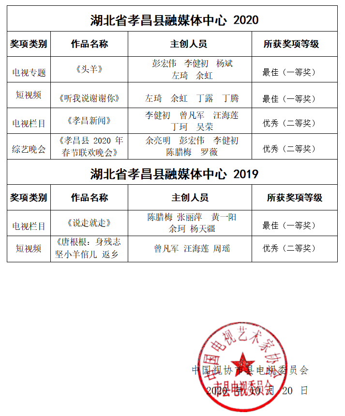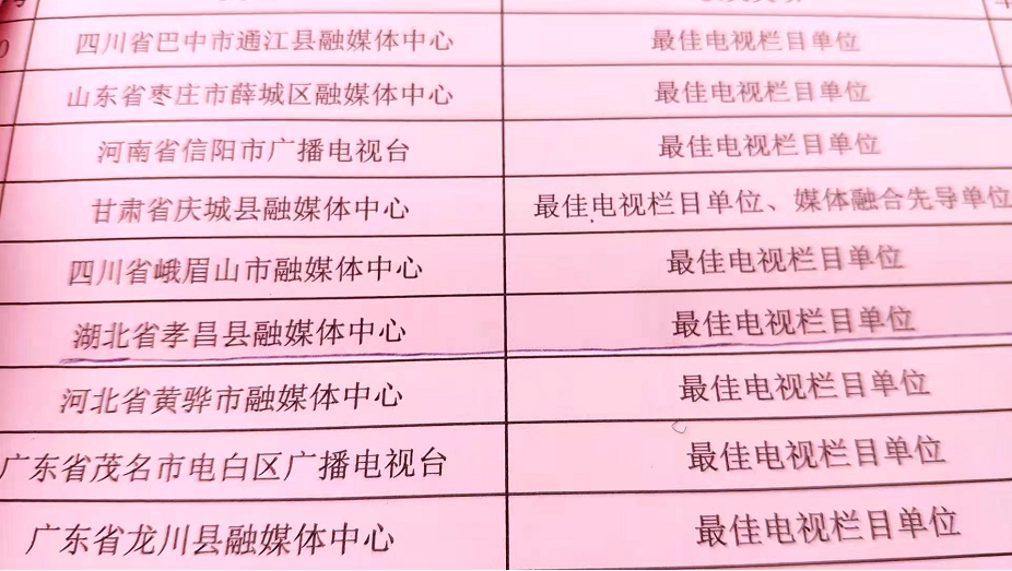 在第八届全国市县电视台、融媒体中心推优展播暨百台论融媒活动中,孝昌县融媒体中心选送的作品荣获2019年度、2020年度最佳电视栏目、最佳电视专题、最佳短视频等三个一等奖,荣获优秀电视栏目、优秀综艺晚会、优秀短视频等三个二等奖,以及“最佳电视栏目单位”称号。