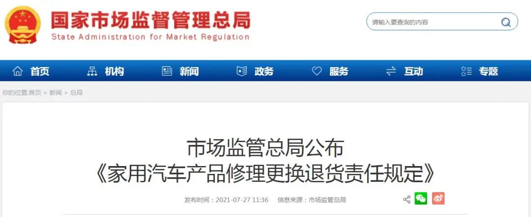 为了加大消费者合法权益的保护力度,对经营者提出更加严格的三包责任要求,国家市场监管总局27日公布《家用汽车产品修理更换退货责任规定》,自2022年1月1日起施行。