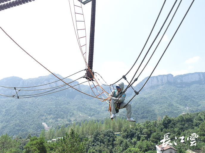8月5日,在湖北省宜昌市三斗坪镇,该公司带电作业人员高琛穿好屏蔽服、安全带,背着十来斤的软梯和绝缘绳登上500千伏峡葛二回线14号杆塔,处理引流板过热的隐患缺陷。“申请进入等电位!”在40米高的杆塔上,高琛手脚协同发力,稳稳地爬到软梯与跳线齐平的位置。塔身侧的配合人员曾璐阳把晃绳缓缓拉起,然后迅速放下,高琛双腿紧紧地钩住软梯,胸口、双臂贴附在软梯上,在高空中划过一道弧线。“滋滋滋!”伴随着刺耳的放电声,高琛顺利进入50万伏等电位。随即,他在70度坡度、40度高温的跳线上进行“诊断”,找出了发热原因,完成3颗严重锈蚀螺栓的更换工作,成功消除此项缺陷,为三峡电力外送大动脉的安全运行保驾护航。