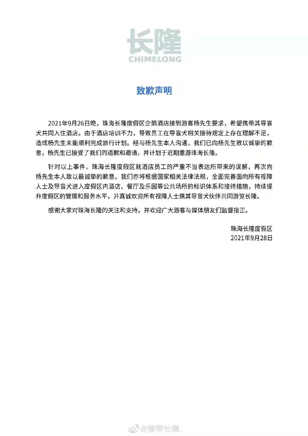 该致歉声明称,9月26日晚,珠海长隆度假区企鹅酒店接到游客杨先生要求,希望携带其导盲犬共同入住酒店。由于酒店培训不力,导致员工在导盲犬相关接待规定上存在理解不足,造成杨先生未能顺利完成旅行计划。经与杨先生本人沟通,已向杨先生致以诚挚的歉意,杨先生已接受了道歉和邀请,并计划于近期重游珠海长隆。