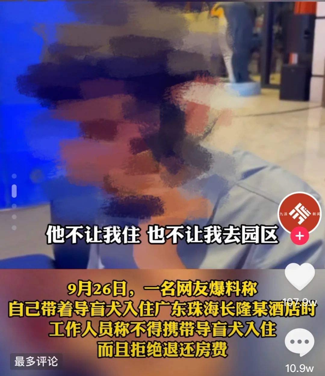 此前报道,9月27日,抖音用户“杨康盲人钢琴调律师”发布视频称,他是一名有视力障碍的盲人,带着导盲犬想入住长隆企鹅酒店时遭到拒绝。