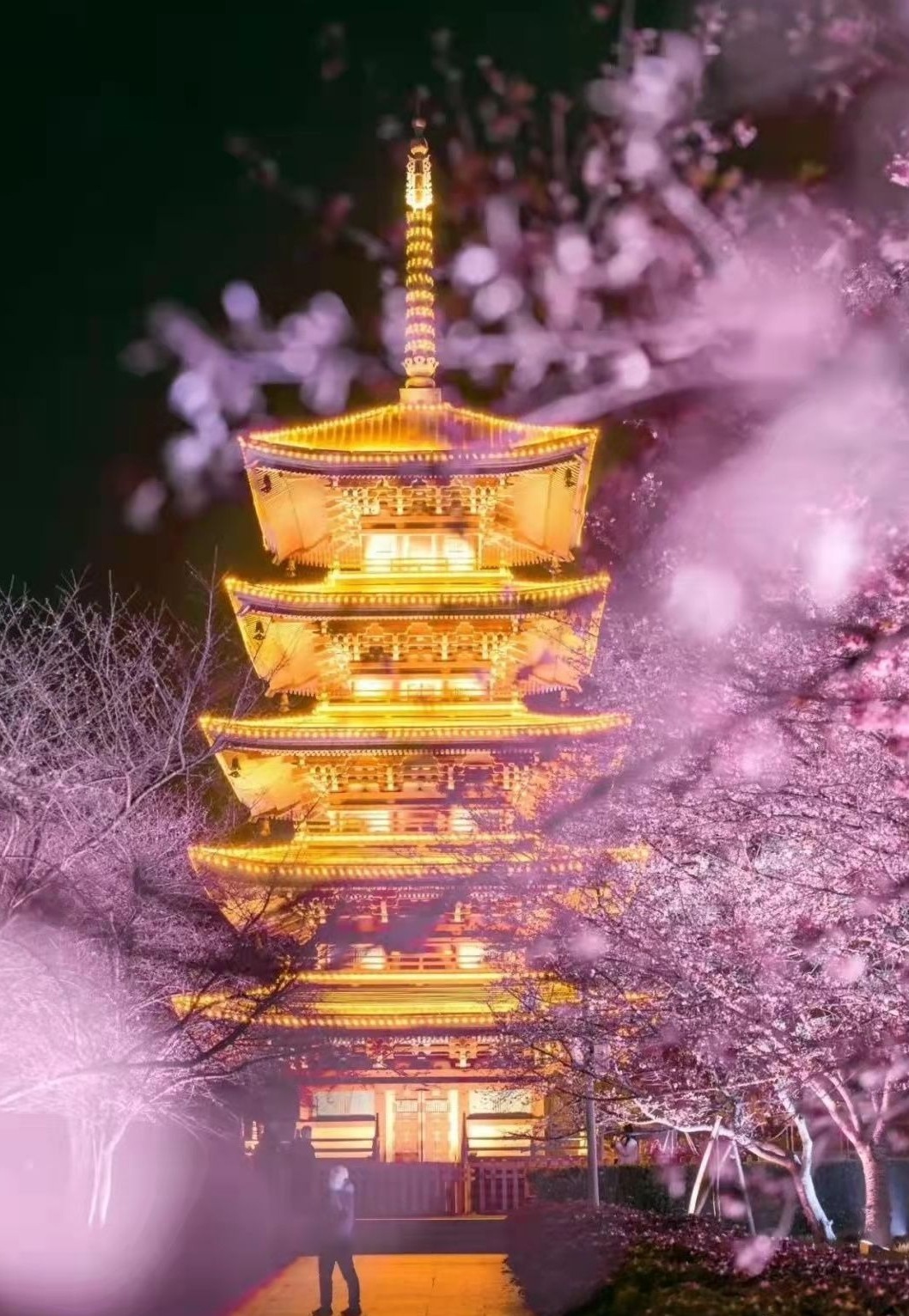 夜赏樱花是磨山的特色。今年樱园新增了五重塔光影秀表演,通过高新科技手段集合五重塔建筑结构,在夜间营造了一个诗意雅致、如梦如幻的奇妙场景。