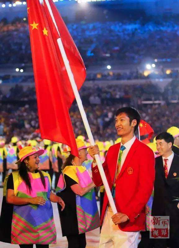 △在第31届夏季奥林匹克运动会开幕式上,旗手雷声引导中国奥运代表团入场。新华社发