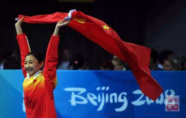 △何雯娜庆祝夺得北京奥运会女子蹦床冠军。 新华社记者程敏摄
