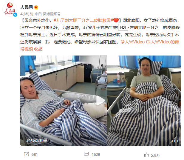 母亲意外烧伤,儿子割大腿三分之二皮肤救母