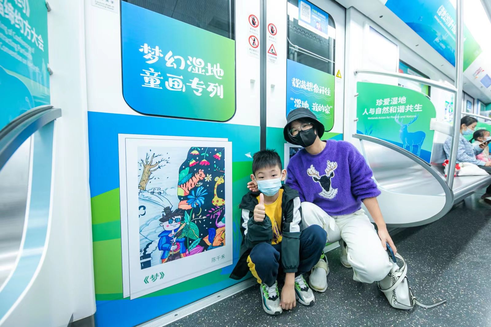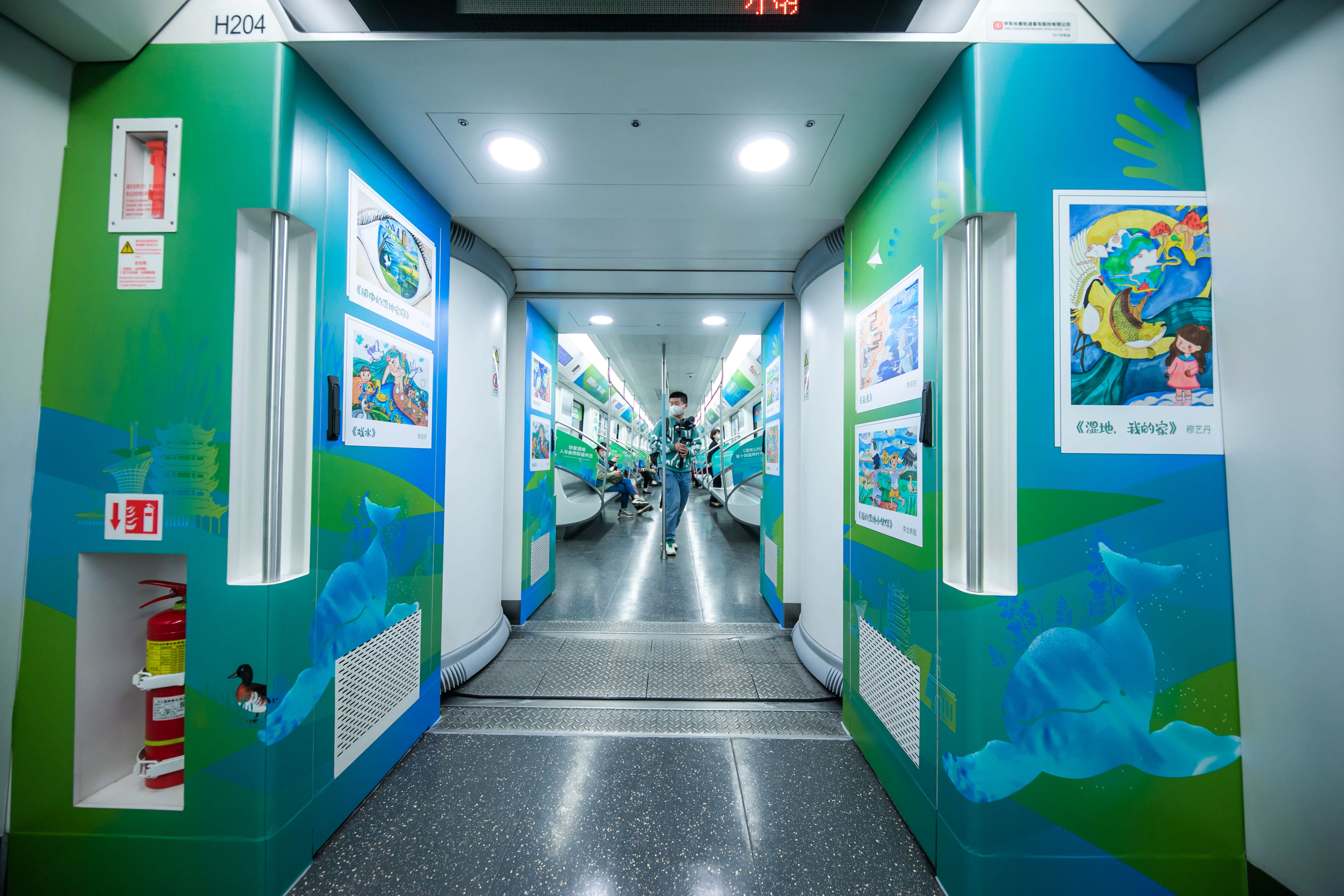 湖北广电融媒体新闻中心记者在8号线“梦幻湿地 童画专列”上看到,车厢内部主题呈清新的蓝绿色,彰显出“珍爱湿地 人与自然和谐共生”的大会主题,童画作品穿插其中,更添灵动活泼。专列共展示了百幅以“湿地 我的家”为主题的童画,均为第九届“最美童画”大赛中的优秀作品。作品均为4—16岁少年儿童创作,囊括了湿地里的各种场景和动物元素,天马行空的想象力碰撞上丰富的色彩,令人眼前一亮。