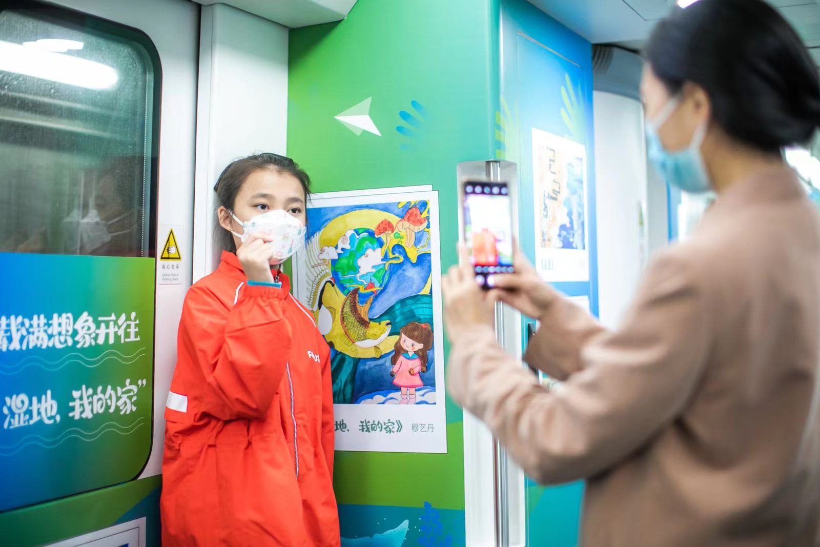 “湿地是星罗棋布的湖群,是池塘,是河流,是水库”“湿地是春天草长莺飞,夏日映日荷花,秋日芦苇悠扬,冬日候鸟栖居……”车厢上用通俗易懂的语言,阐释了湿地的不同形态和景观特色,市民在欣赏童画的同时,还能收获湿地相关的科普知识。
