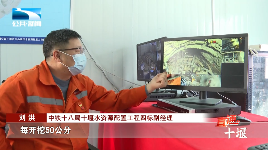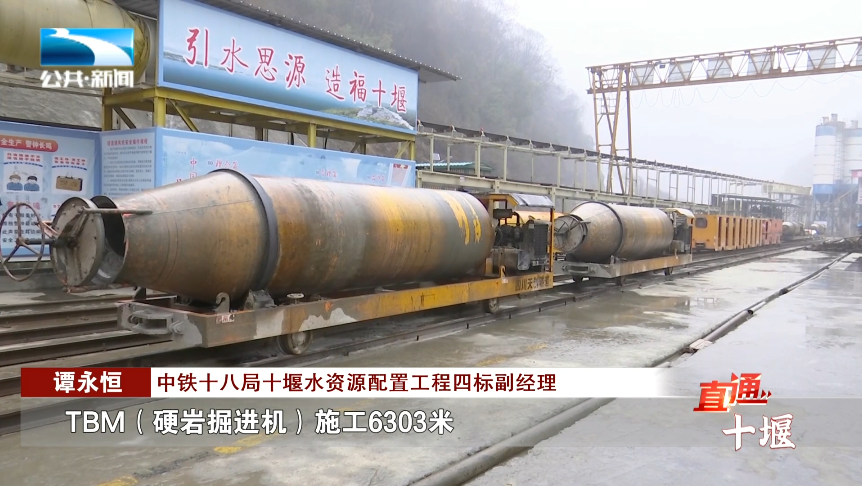 中铁十八局十堰水资源配置工程四标副经理 谭永恒:“目前主要是总进度达到6666米,TBM(硬岩掘进机)施工6303米,为了保证施工进度,咱们春节期间工人不放假,克服一切困难进度朝前赶,保证安全质量。”