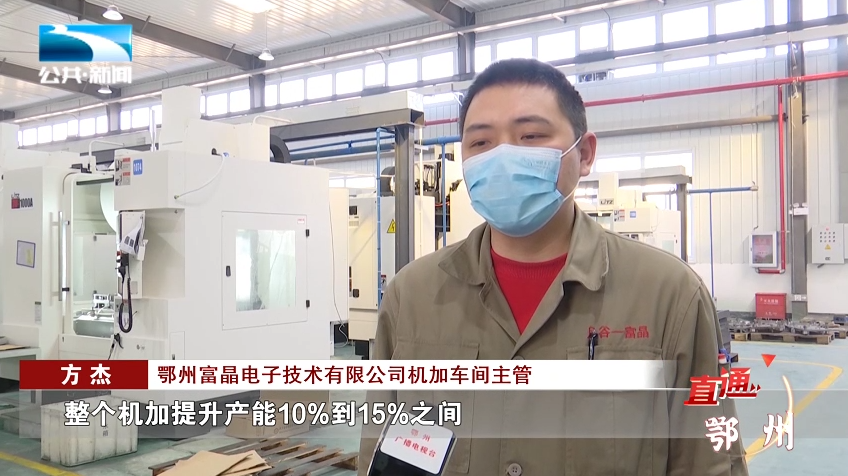 鄂州富晶电子技术有限公司机加车间主管 方杰:“目前整个机加人数在45人左右,单日机加产量1200套,每月完成2万多套,目前的话,整个机加提升产能10%到15%之间。”