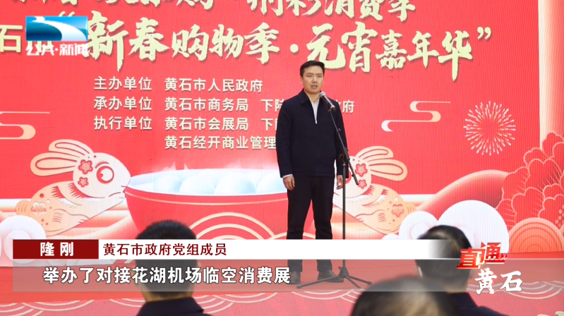 黄石市政府党组成员 隆刚:“举办了对接花湖机场临空消费展、首届鄂东精品酒类展、钟楼烟火美食街开街、商圈年货节、网上年货节等各类美食展。”