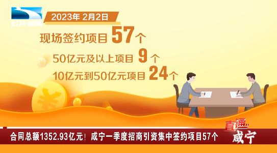 2月2日上午,咸宁市举行2023年一季度“香城泉都春意浓”招商引资项目集中签约活动,57个项目集中签约,合同金额总计1352.93亿元。