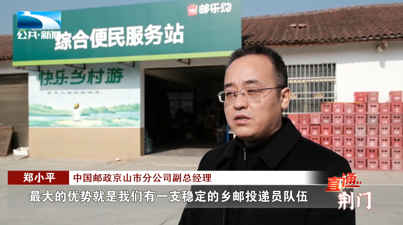 中国邮政京山市分公司副总经理 郑小平:“最大的优势就是我们有一支稳定的乡邮投递员队伍,把门店进行了形象统一,也进行了固定的投放,另外我们在快递进村方面还加快了‘邮快’合作,由我们主导,总共有8家快递一起进村。”