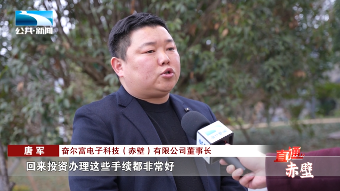 奋尔富电子科技(赤壁)有限公司董事长 唐军:“我也是赤壁人,我的整体感觉赤壁改变还是很大的,回来投资办理这些手续都非常好,包括用工,整体上领导都是非常重视的,而且这个资金,也给我们提供了很多平台,提供了很多帮助,市政府给我们这么大的信心,我们还是很有信心把它做好。”