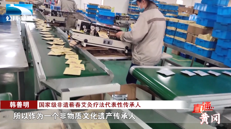 国家级非遗蕲春艾灸疗法代表性传承人 韩善明:“这款产品在2021年这一年,我们蕲春有一家企业,年销量5亿贴,产值就是将近20个亿。所以作为一个非物质文化遗产传承人,你不仅仅是传承文化,更多地让我们的思想(助推)研究出好的产品,服务我们的产业的发展,为我们这个产业的持续发展进行赋能。”