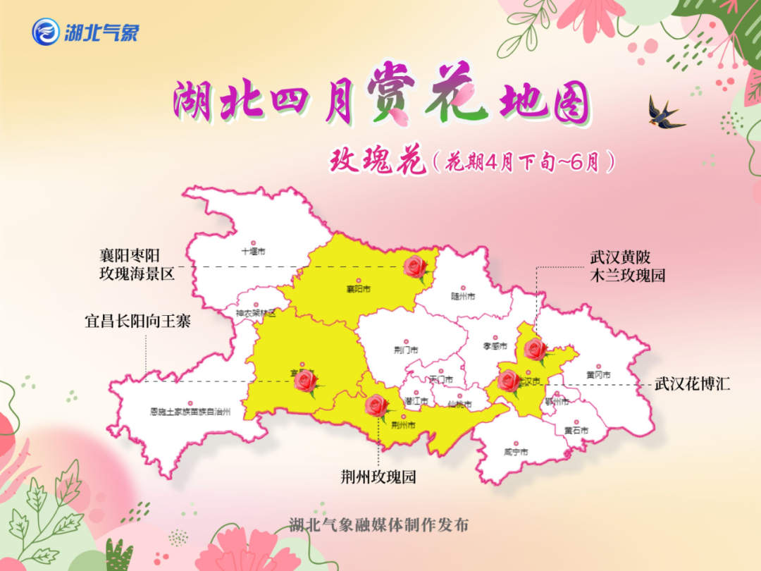 武汉花博汇有80余个品种,10万多株玫瑰和月季;武汉黄陂木兰玫瑰园则种植有3000多亩观赏玫瑰,让这里的每一口空气都有玫瑰香;襄阳枣阳玫瑰海景区,种类繁多,花期较长,一般4月底会集中开放;荆州玫瑰园数万株玫瑰竞相开放,铺成一片玫瑰的海洋;宜昌长阳向王寨,万株玫瑰也将迎着春风盛开。