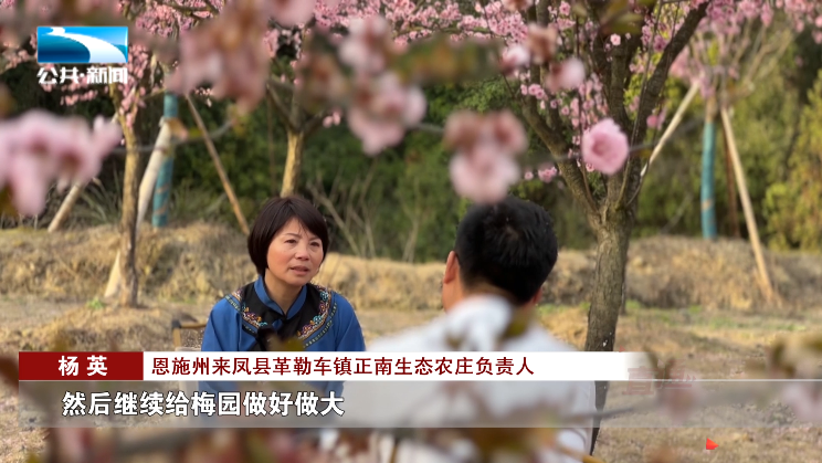 恩施州来凤县革勒车镇正南生态农庄负责人 杨英:“然后我就想卖了的话,村子里面也什么都没有了,又变成以前死气沉沉的了,老百姓也没有收益了,然后就放弃了卖梅花的念头,然后继续把梅园做好做大,跟老百姓一起来致富。”
