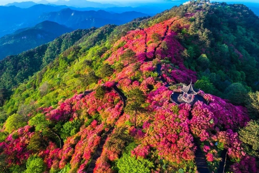 拥有10万亩原生态古杜鹃花的龟峰山,被誉为“大别山上最美红飘带”,也是世界上最大的古杜鹃群落。