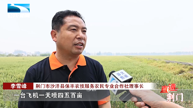 荆门市沙洋县保丰农技服务农民专业合作社理事长 李雪峰:“一台飞机一天喷四五百亩,比较轻松,今年的长势情况,我们防治的这一片田,在整个江汉平原已经算非常高产了,今年(亩产)有望超过900斤。”