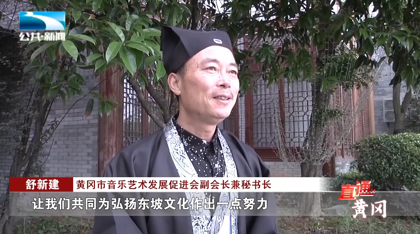 黄冈市音乐艺术发展促进会副会长兼秘书长 舒新建:“今天氛围特别好,刚才也在里面唱了歌表演了节目,让我们共同为弘扬东坡文化作出一点努力。”