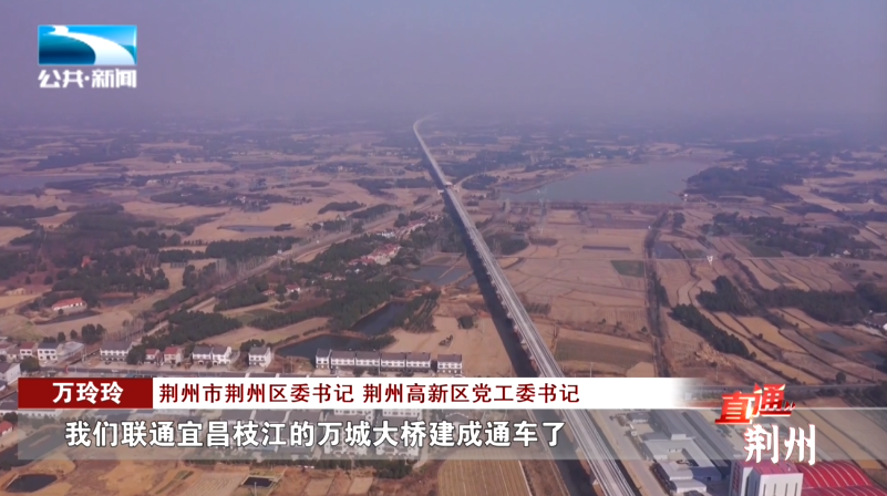 荆州市荆州区委书记 荆州高新区党工委书记 万玲玲:“比如说,荆荆铁路已进入了上部结构施工阶段。我们荆州火车站北站房主体结构已经顺利完成封顶,我们联通宜昌枝江的万城大桥建成通车了,联通荆门沙洋的271省道的升级工程,已完成了工程量一半以上。李埠长江公铁大桥、二广高速(绕城段)改线工程、荆州西站规划建设、428省道改扩建,这些项目都在有序地推进。”