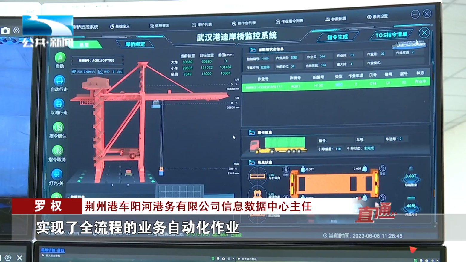 荆州港车阳河港务有限公司信息数据中心主任 罗权:“集装箱业务在内河港口是比较复杂的,我们通过自动化改造以后可以实现集装箱装卸进提。四大港口业务的自动化作业目前是在5G+、无人集卡的毫米波雷达、高精地图这一块的技术支持下实现了全流程的业务自动化作业。”