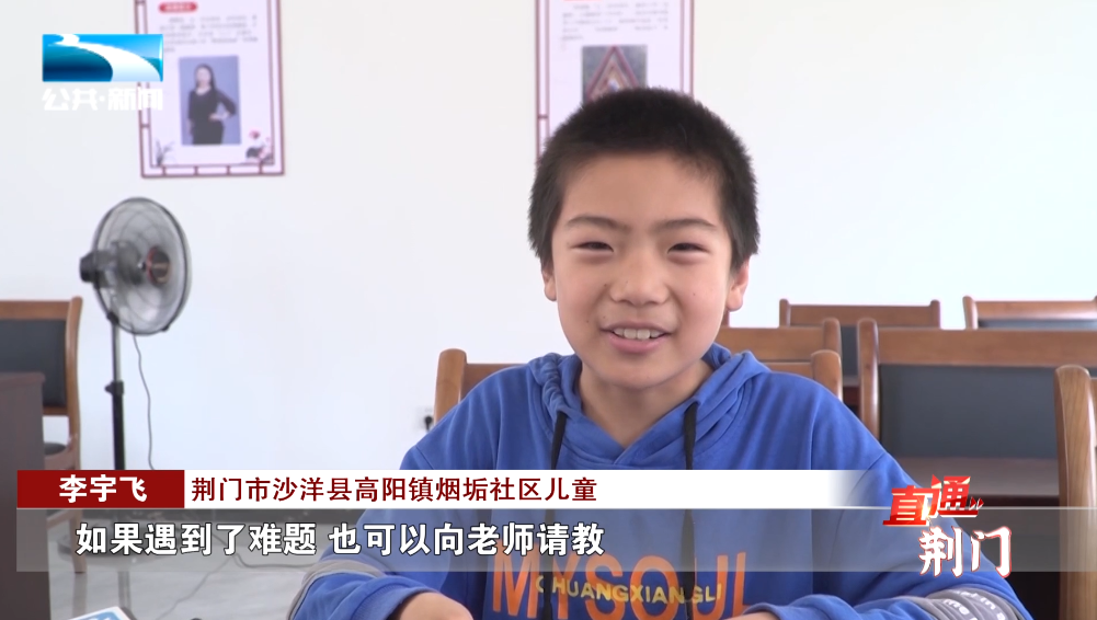 荆门市沙洋县高阳镇烟垢社区儿童 李宇飞:“自从来到这个学校之后,奶奶也不愁了,我也开心了。这里有许多我可以请教的同学,如果遇到了难题,也可以向老师请教。”
