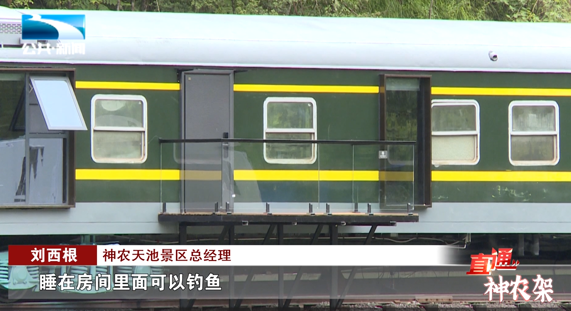 神农天池景区总经理 刘西根:“我们把它内部进行了改造,外部保留了原始的绿皮火车的状态,然后迎湖而建,让大家有更好的体验感,推开窗户就可以欣赏湖景,睡在房间里面可以钓鱼。”
