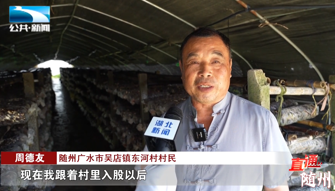 随州广水市吴店镇东河村村民 周德友:“现在我跟着村里入股以后,自己搞的食用菌棚有167个棚,袋料20万棒,计划在年底以内总产值要达到160万元。”