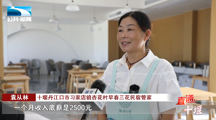 十堰丹江口市习家店镇杏花村早春三花民宿管家 袁从林:“以前靠打零工,一天赚80块钱,有活干了就挣80块钱,没活干了就在家里面玩,现在来到这里当管家了,一个月收入底薪是2500元,加一下班2800至3000块钱。”