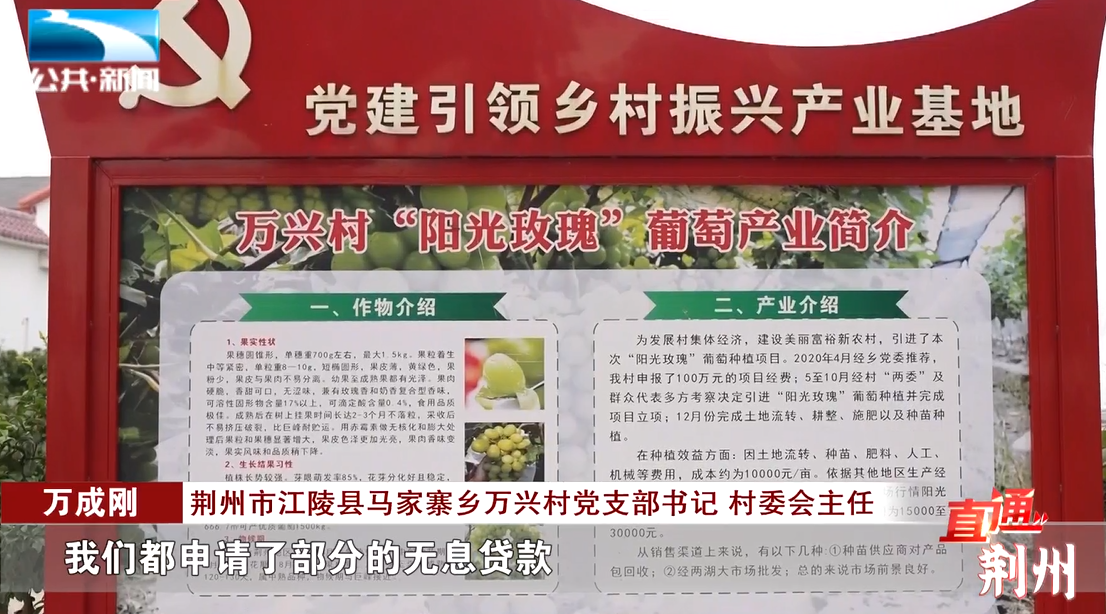 荆州市江陵县马家寨乡万兴村党支部书记、村委会主任 万成刚:“开始有村民少量地种,村两委会根据了解,感觉种葡萄的效益比较好,所以村集体准备划一块地,大规模地种,大规模种引起效益以后,第一是好带动市场,第二是吸引周边村民跟着种,通过村集体100亩的建设陆续带动村里28余户在种,规模基本上也上来了。”