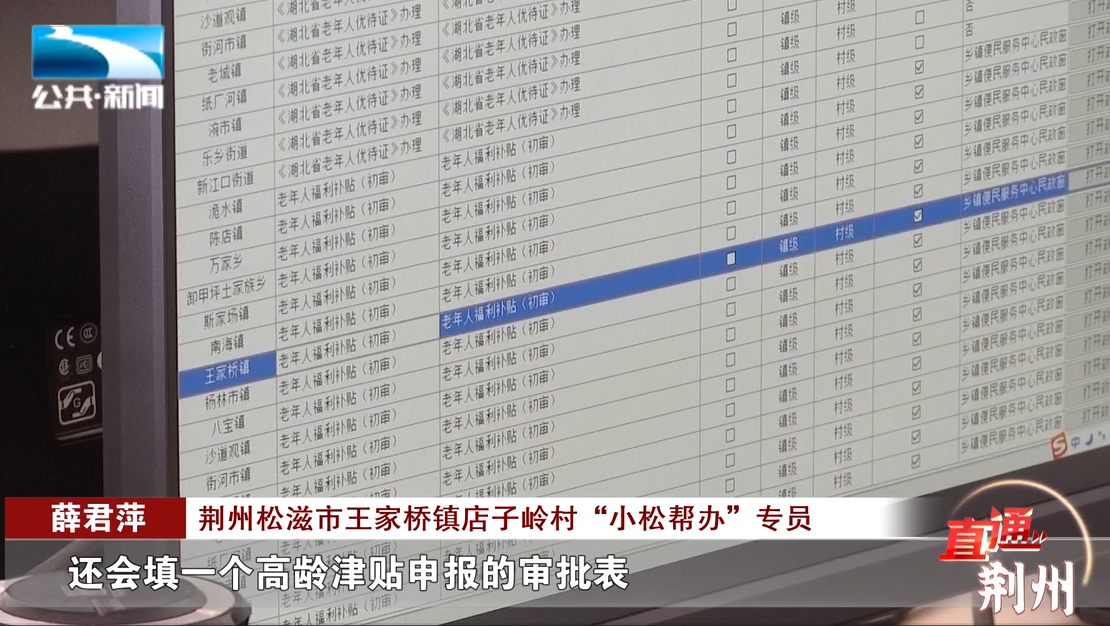 荆州松滋市王家桥镇店子岭村“小松帮办”专员 薛君萍:“这是老年人福利补贴初审,就是我们会上门收这上面所需要的材料,还会填一个高龄津贴申报的审批表,我把资料收集好了之后就录系统,证来了之后就给他送到家。”
