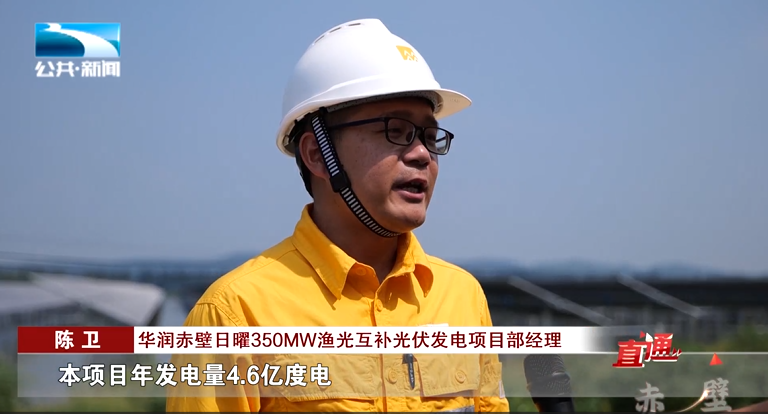 华润赤壁日曜350MW渔光互补光伏发电项目部经理 陈卫:“本项目年发电量4.6亿度电,上网电价0.4161元,与相同火电相比可节约标煤13万吨,可减少二氧化硫排放3300吨,可减少氮氧化物排放2800吨,可减少二氧化碳排放33万吨。”
