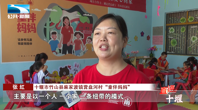 十堰市竹山县麻家渡镇营盘河村“童伴妈妈” 张红:“主要是以一个人、一个家、一条纽带的模式,对我们的留守儿童进行生活上的帮助、学习上的辅导和情感上的抚慰,对有监护缺失等重点儿童,提供监护指导、返校复学、社会救助等关爱服务。”