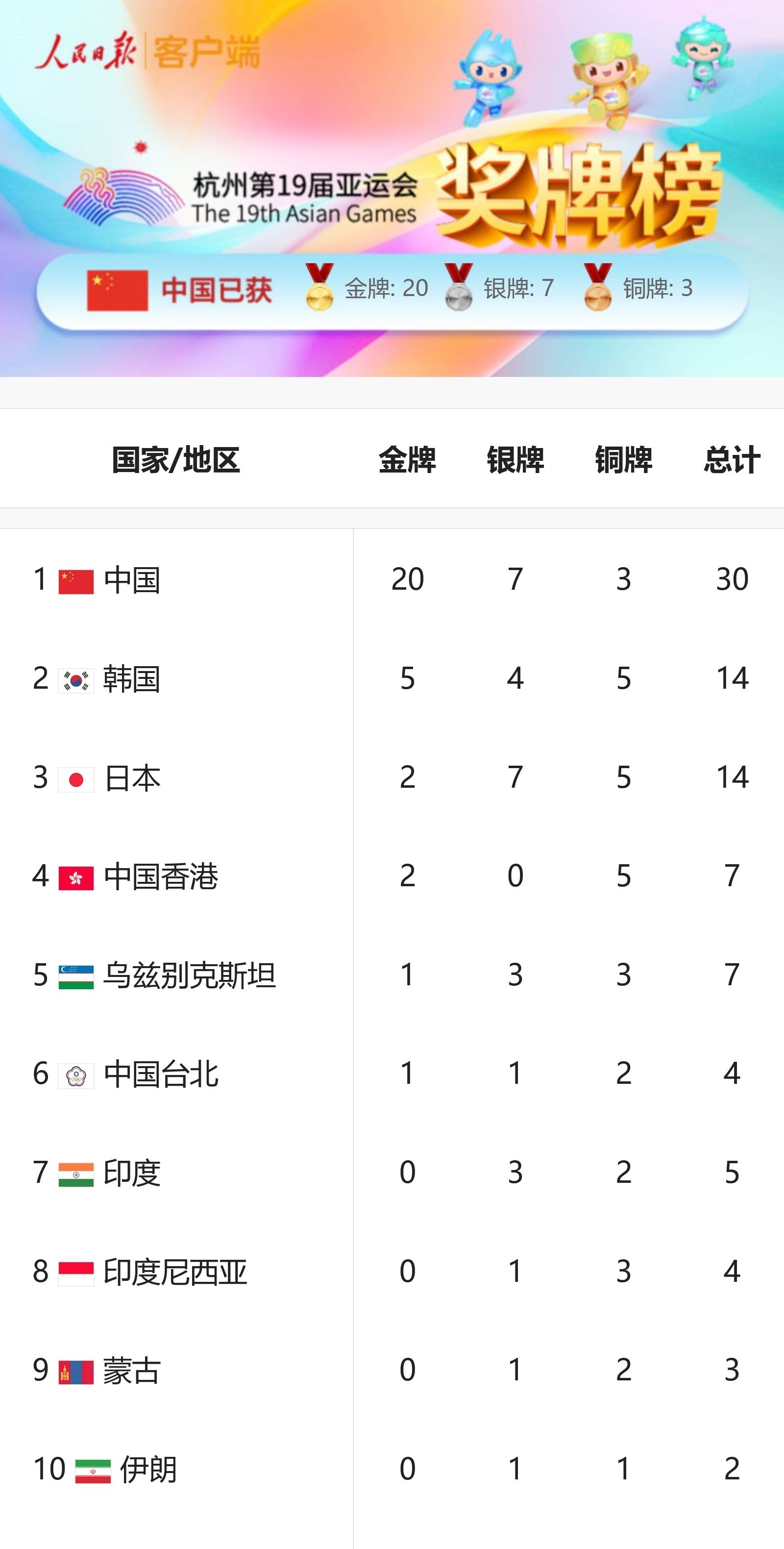 今天,杭州亚运会开幕后首个比赛日,中国队获得20金7银3铜,位列奖牌榜第一名。其中,中国赛艇队3小时内连续斩获6金;中国游泳队今晚包揽7金,且每个项目都打破了纪录。祝贺!继续加油!