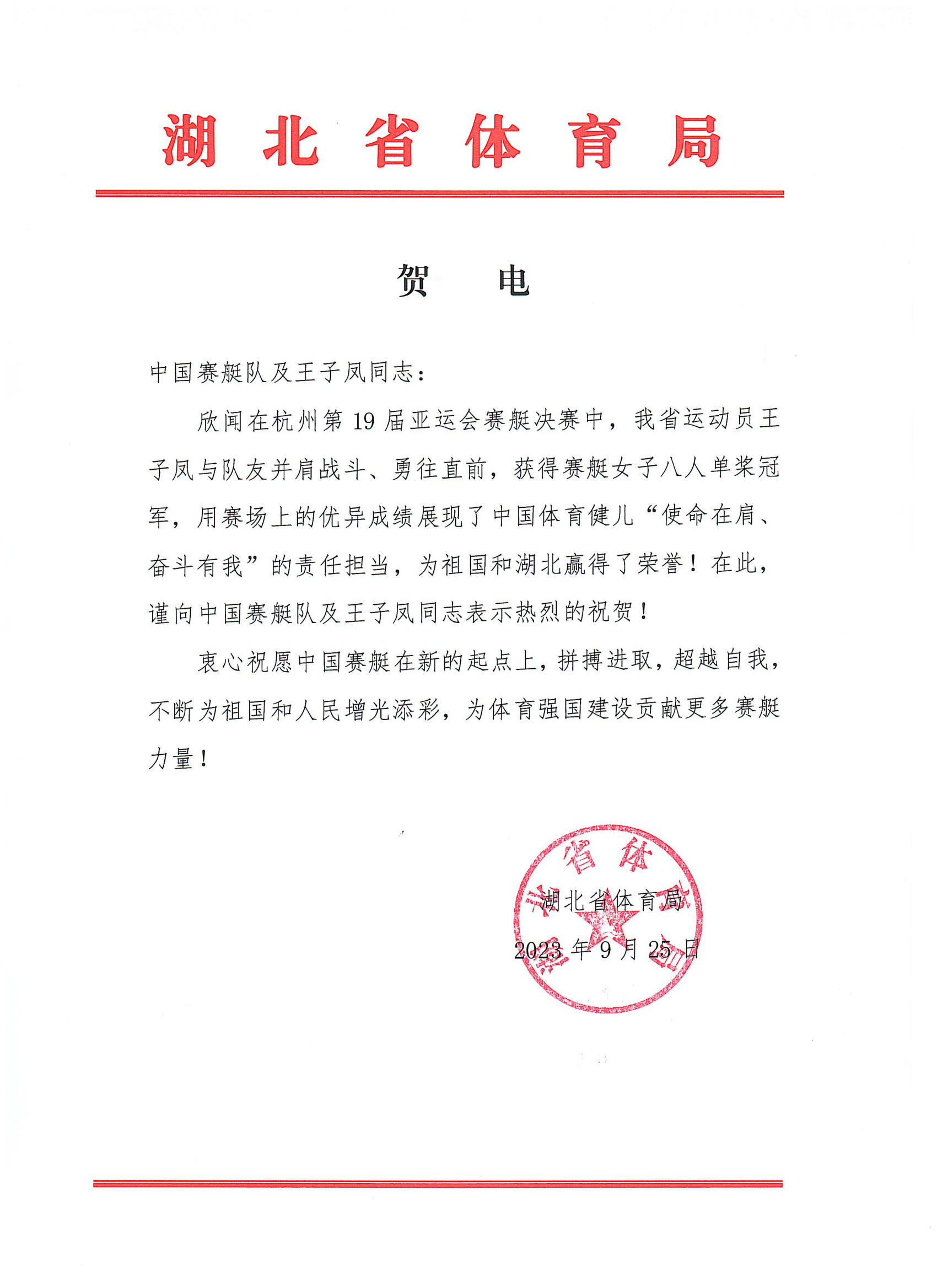 湖北省体育局也发来贺电,祝贺中国赛艇队和王子凤取得好成绩!