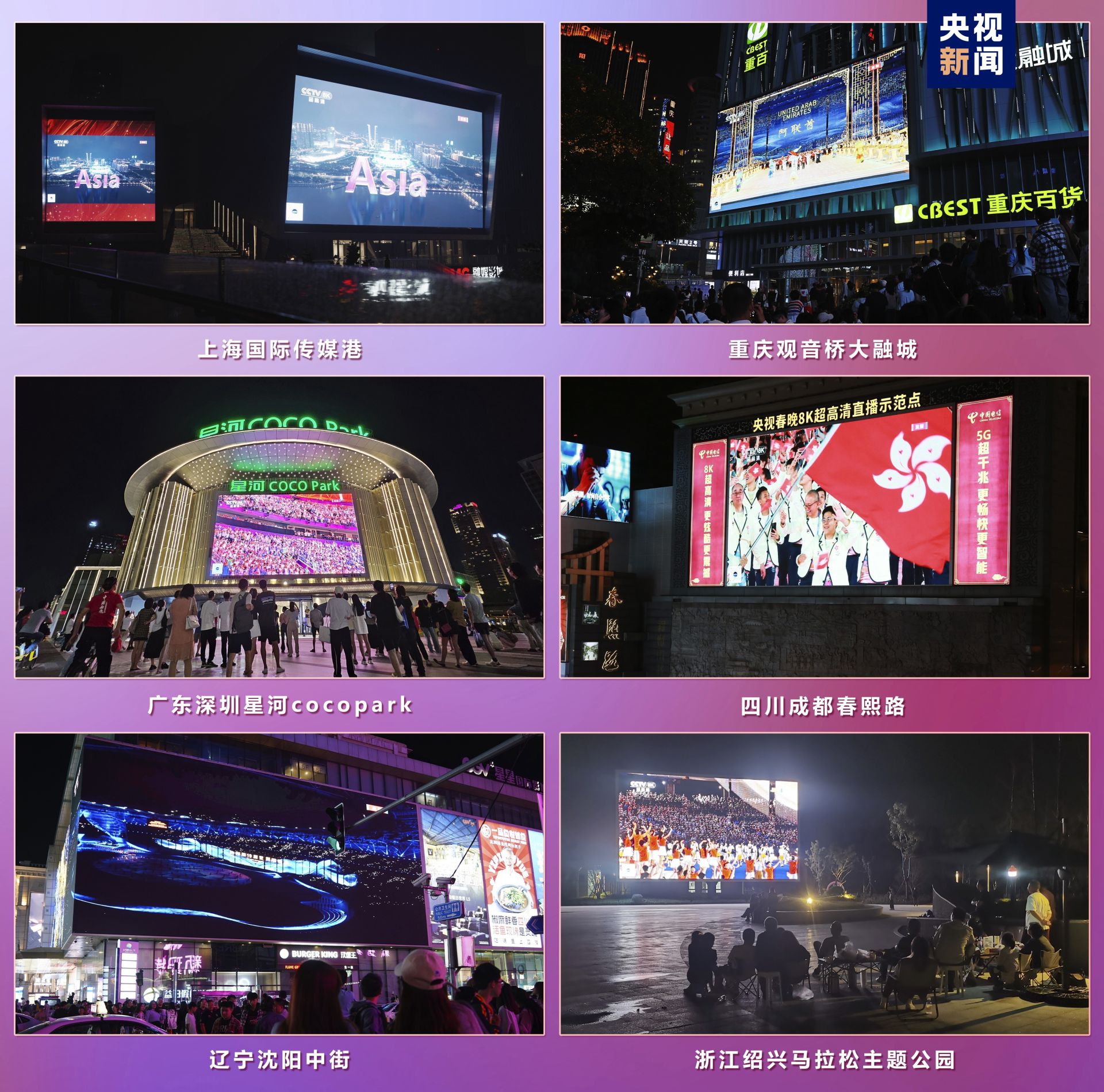 点亮百城千屏,城市地标飘满中国红。浙江、北京、四川、甘肃等全国90个城市710余块户外地标公共大屏上,市民通过“百城千屏”直播看开幕式,超高清的画面让拼搏昂扬的运动精神、熠熠生辉的中华文化、丰富浓郁的亚洲风情扑面而来,带给市民身临其境的沉浸感受。