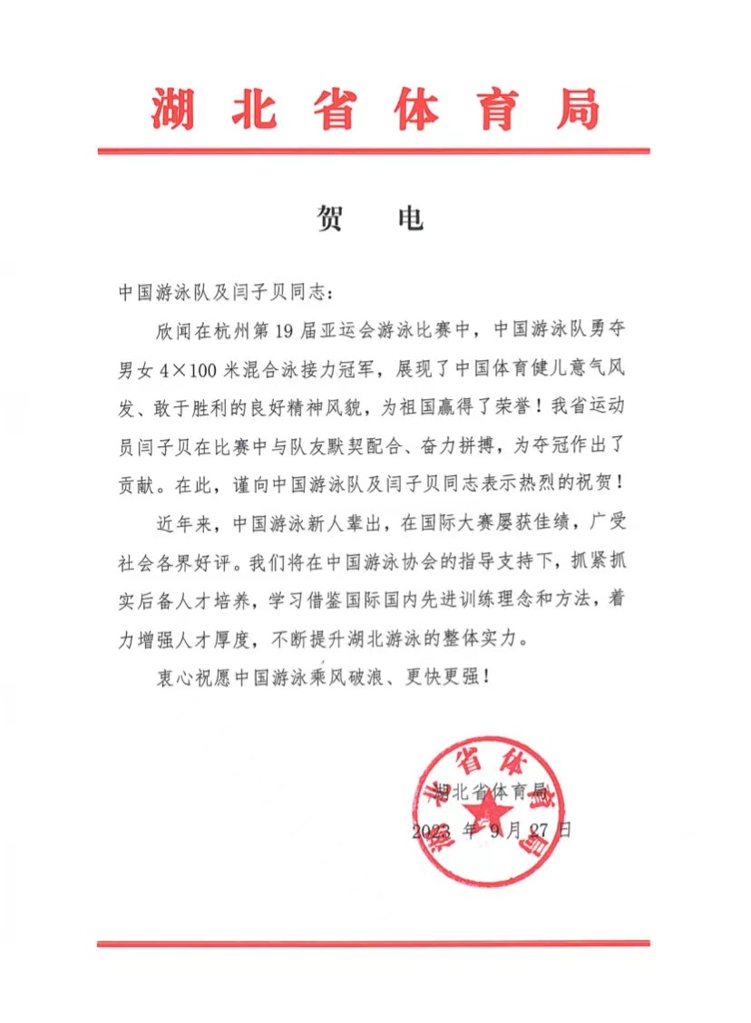9月27日,杭州第19届亚运会男女4×100米混合泳接力决赛,中国队夺得金牌,打破亚洲纪录。湖北省运动会闫子贝在比赛中与队友默契配合、奋力拼搏,为夺冠作出了贡献。湖北省体育局发来贺电,向中国游泳队及闫子贝表示热烈的祝贺!