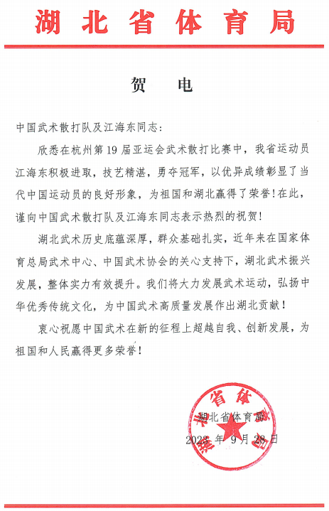 9月28日,杭州第19届亚运会武术散打比赛中,武术散打男子56公斤级决赛中,湖北选手江海东以绝对优势战胜菲律宾选手阿内尔,为中国代表团再添一枚金牌。湖北省体育局发来贺电,向中国武术散打队及江海东表示热烈的祝贺!