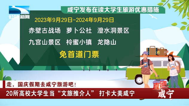 为吸引游客,咸宁还发布了针对全国在读大学生的旅游优惠措施:从今年9月29日至明年9月29日,赤壁古战场、萝卜公社、澄水洞景区、九宫山景区、柃蜜小镇、龙隐山等6家景区对全国在读大学生免首道门票,蜜泉湖旅游度假区、康丰源生态旅游区、光年城堡3家景区门票享5折优惠。同时还发布了针对全国游客乘高铁游咸宁优惠措施,从2023年9月29日至12月31日,对持有一周内到咸宁北站、赤壁北站高铁票的全国游客,萝卜公社、澄水洞景区、光年城堡、九宫山景区、龙隐山等5家景区首道门票免费,三国赤壁古战场景区首道门票五折优惠。