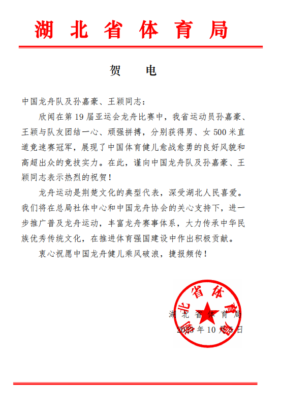 10月5日,在刚刚结束的杭州亚运会龙舟比赛中,中国队分别获得男、女500米直道竞速赛冠军。湖北省体育局发来贺电,盛赞湖北运动员孙嘉豪、王颖与队友默契配合、冲锋向前,向中国龙舟队及孙嘉豪、王颖同志表示热烈的祝贺。