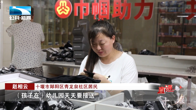 十堰市郧阳区青龙泉社区零工超市工作人员 王磊:“每天主要的工作就是翻袜子、包装袜子,每天干了多少有专人记工,比如翻1000双袜子可以兑换10个积分,也可以兑换10块钱,非常灵活,积分可以在我们这里买东西。”