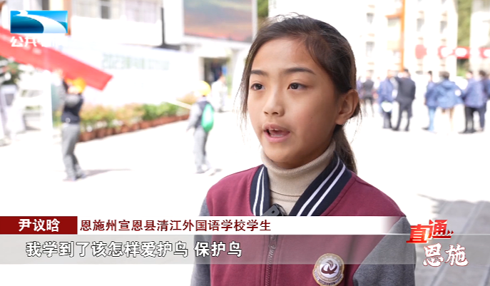 恩施州宣恩县清江外国语学校学生 尹议晗:“我学到了该怎样爱护鸟、保护鸟,学会珍惜它,不要伤害它,有人要破坏鸟巢的时候我会劝阻他们,做一个爱鸟、保护鸟的护鸟使者。”