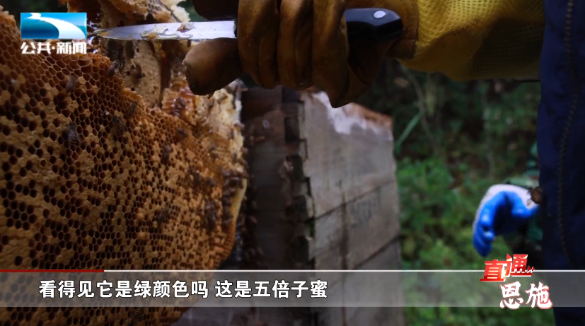 恩施州咸丰县清坪镇官敞坝村村民 雷杨:“一块就出来了,看得见它是绿颜色吗?这是五倍子蜜,割出来它就变成琥珀色了。”