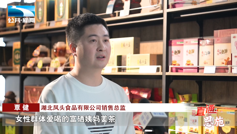 湖北凤头食品有限公司销售总监 覃健:“开发了不同的系列产品,就像现在小孩子爱吃的姜糖,女性群体爱喝的富硒姨妈姜茶,以前我们的生姜全年只能卖个五六百万元左右,现在基本上可以达到1200万元左右。”