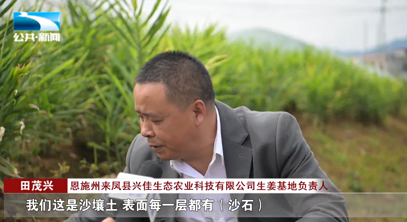 恩施州来凤县兴佳生态农业科技有限公司生姜基地负责人 田茂兴:“我们这是沙壤土,表面每一层都有(沙石),它的主要作用是通透性好,凤头姜它就是块茎大、脆、多汁。”